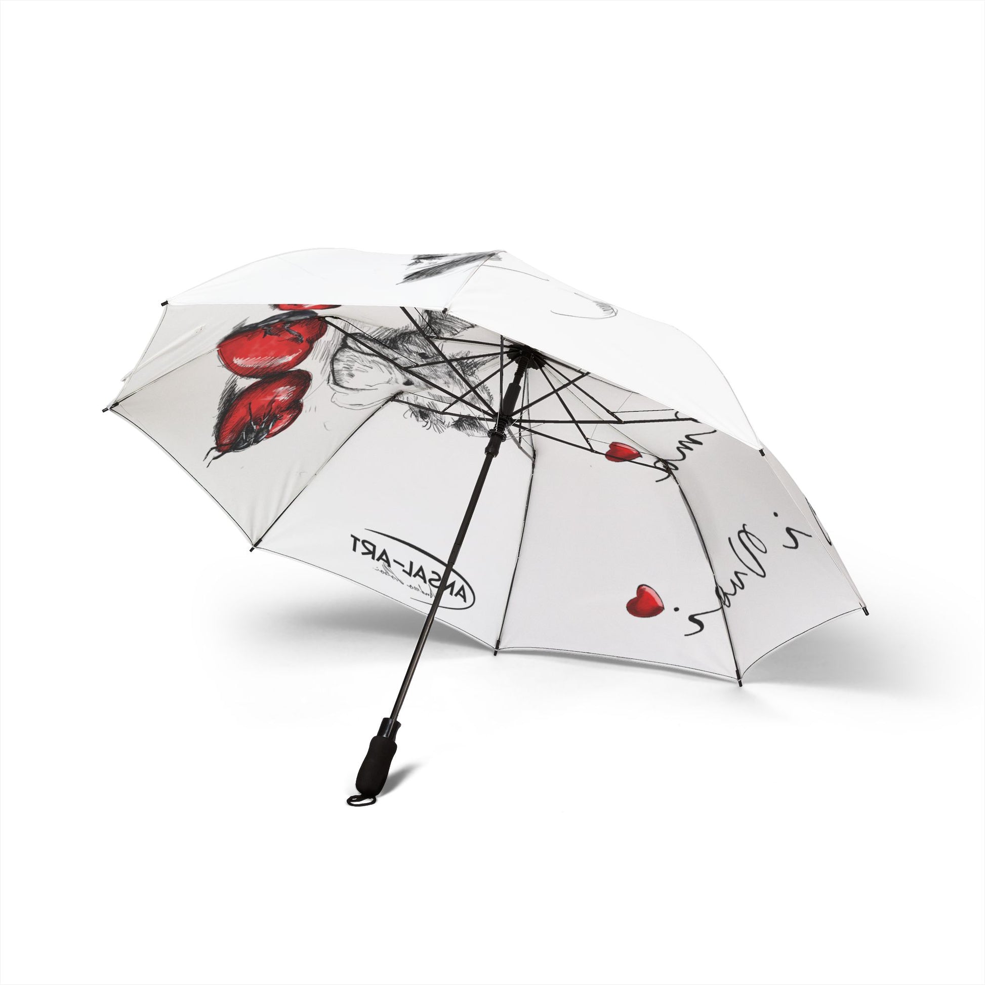 A lightweight, semi-automatic foldable umbrella with a soft white canopy printed with a tender watercolor illustration of two gently touching horses and scattered tiny red hearts. The design is heat-sublimated into durable 100% polyester pongee fabric so the artwork stays vibrant through rainy seasons. With eight strong fiber ribs and a sturdy rubber handle, the umbrella opens one-handed in a second and packs away into a matching sleeve with wrist strap and Velcro tie for secure storage. It’s built for everyday use — reliable in sudden showers while carrying a quiet, heartfelt aesthetic that reads like a small, personal keepsake.