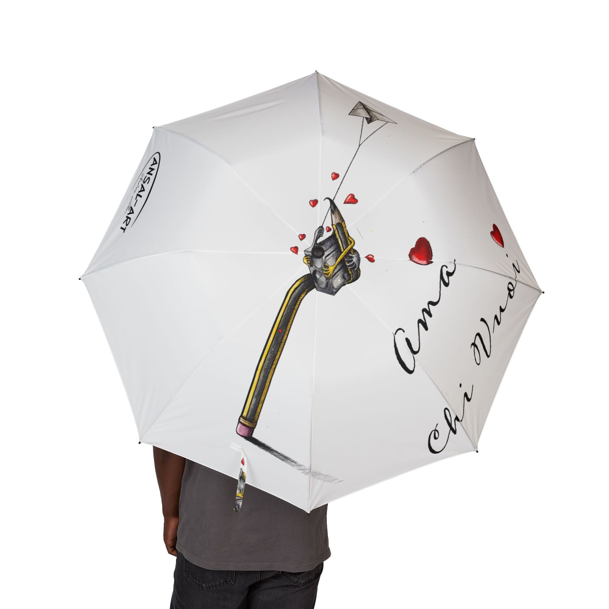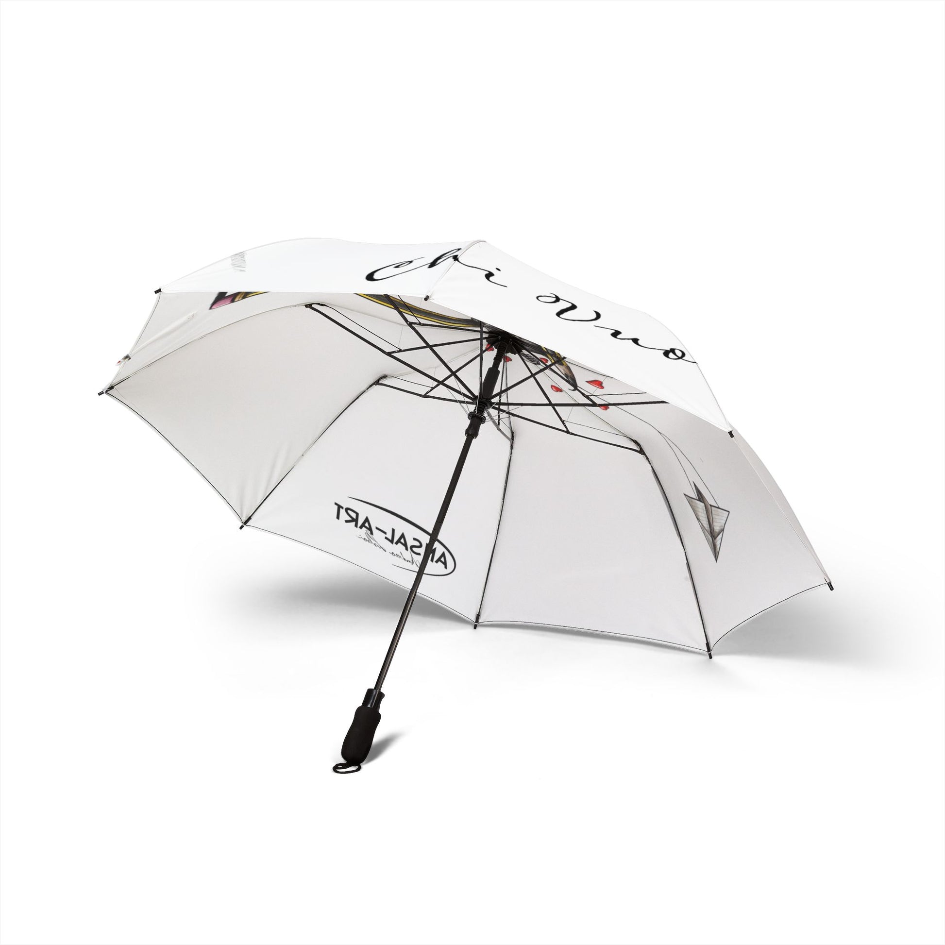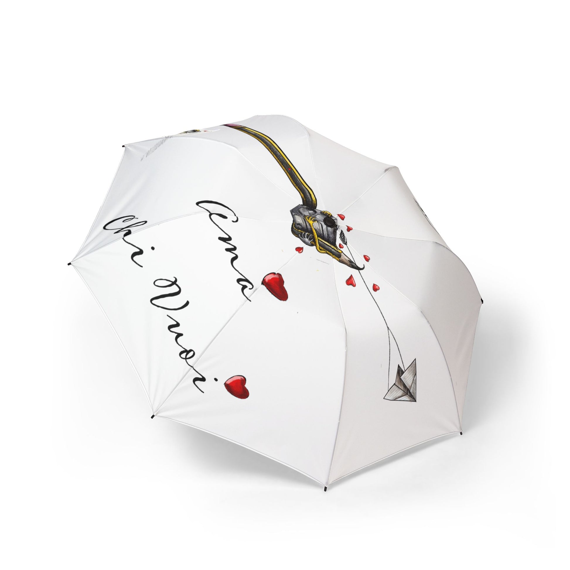 A lightweight, semi-automatic foldable umbrella with a soft white canopy printed with a tender watercolor illustration of two gently touching horses and scattered tiny red hearts. The design is heat-sublimated into durable 100% polyester pongee fabric so the artwork stays vibrant through rainy seasons. With eight strong fiber ribs and a sturdy rubber handle, the umbrella opens one-handed in a second and packs away into a matching sleeve with wrist strap and Velcro tie for secure storage. It’s built for everyday use — reliable in sudden showers while carrying a quiet, heartfelt aesthetic that reads like a small, personal keepsake.
