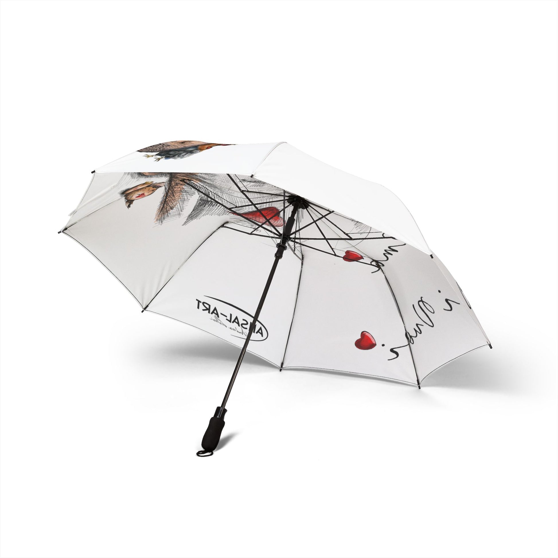 A lightweight, semi-automatic foldable umbrella with a soft white canopy printed with a tender watercolor illustration of two gently touching horses and scattered tiny red hearts. The design is heat-sublimated into durable 100% polyester pongee fabric so the artwork stays vibrant through rainy seasons. With eight strong fiber ribs and a sturdy rubber handle, the umbrella opens one-handed in a second and packs away into a matching sleeve with wrist strap and Velcro tie for secure storage. It’s built for everyday use — reliable in sudden showers while carrying a quiet, heartfelt aesthetic that reads like a small, personal keepsake.