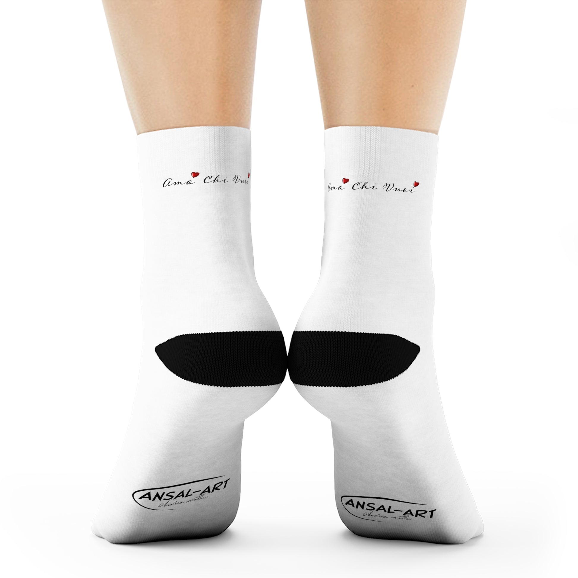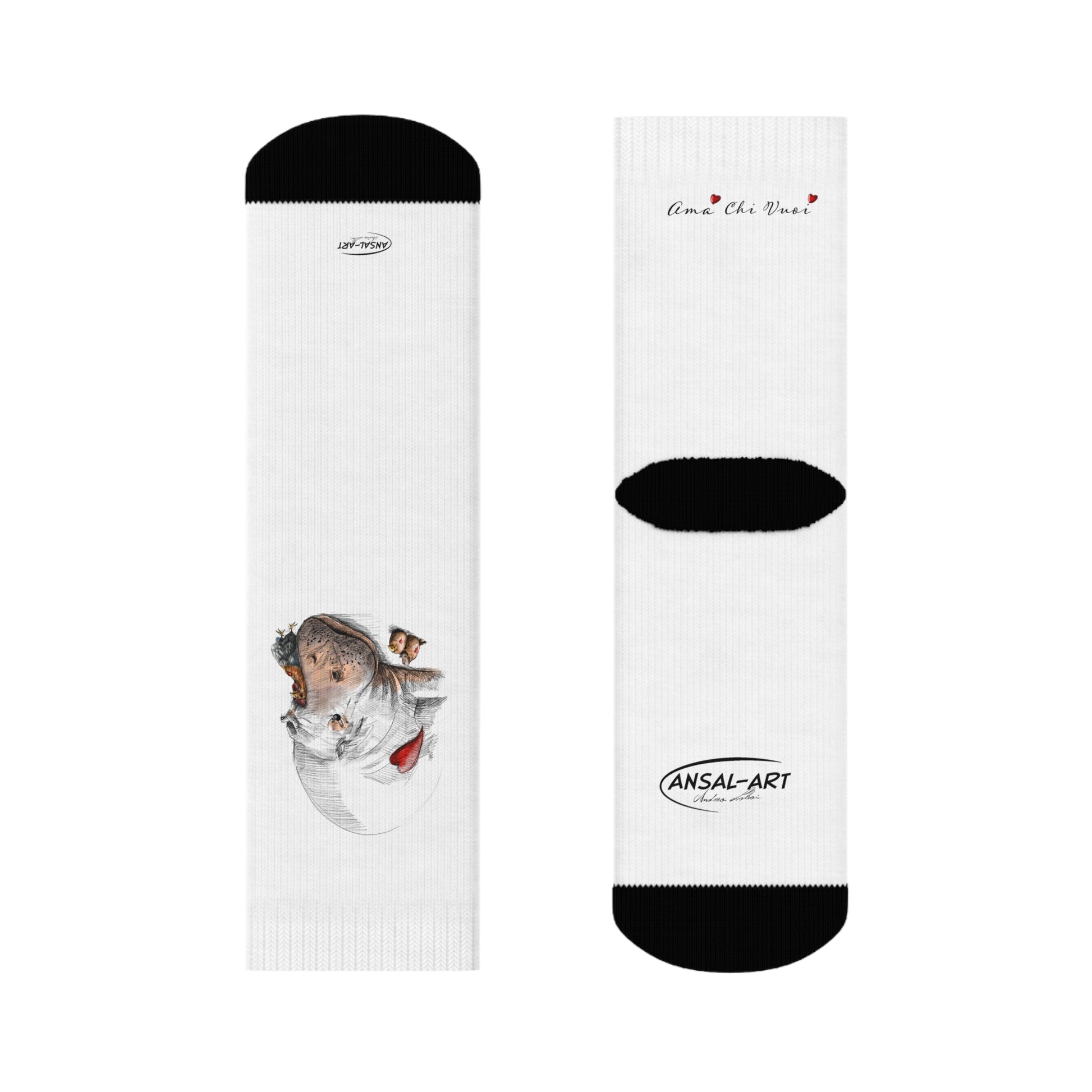 Lightweight white crew socks with a delicate, watercolor-inspired whale motif and tiny red heart accents. The feel is soft underfoot thanks to cushioned bottoms, while the seamless toes and black contrast heel and toe keep wear comfortable and low-profile. These socks bring a quiet, oceanic charm to everyday outfits — slip them on for slow mornings, coastal walks, or to add a subtle artful detail to your casual looks.